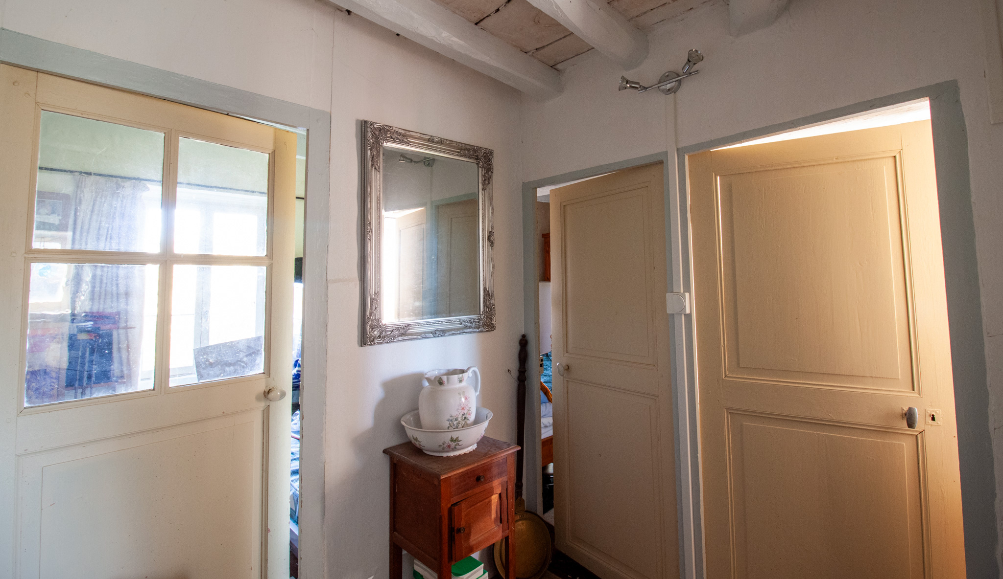 À l’étage, la maison propose trois petites chambres, parfaites pour accueillir une famille, des invités ou pour créer un bureau. Un coin salle d’eau complète ce niveau, avec la possibilité de le repenser et de le moduler selon vos envies et vos besoins.