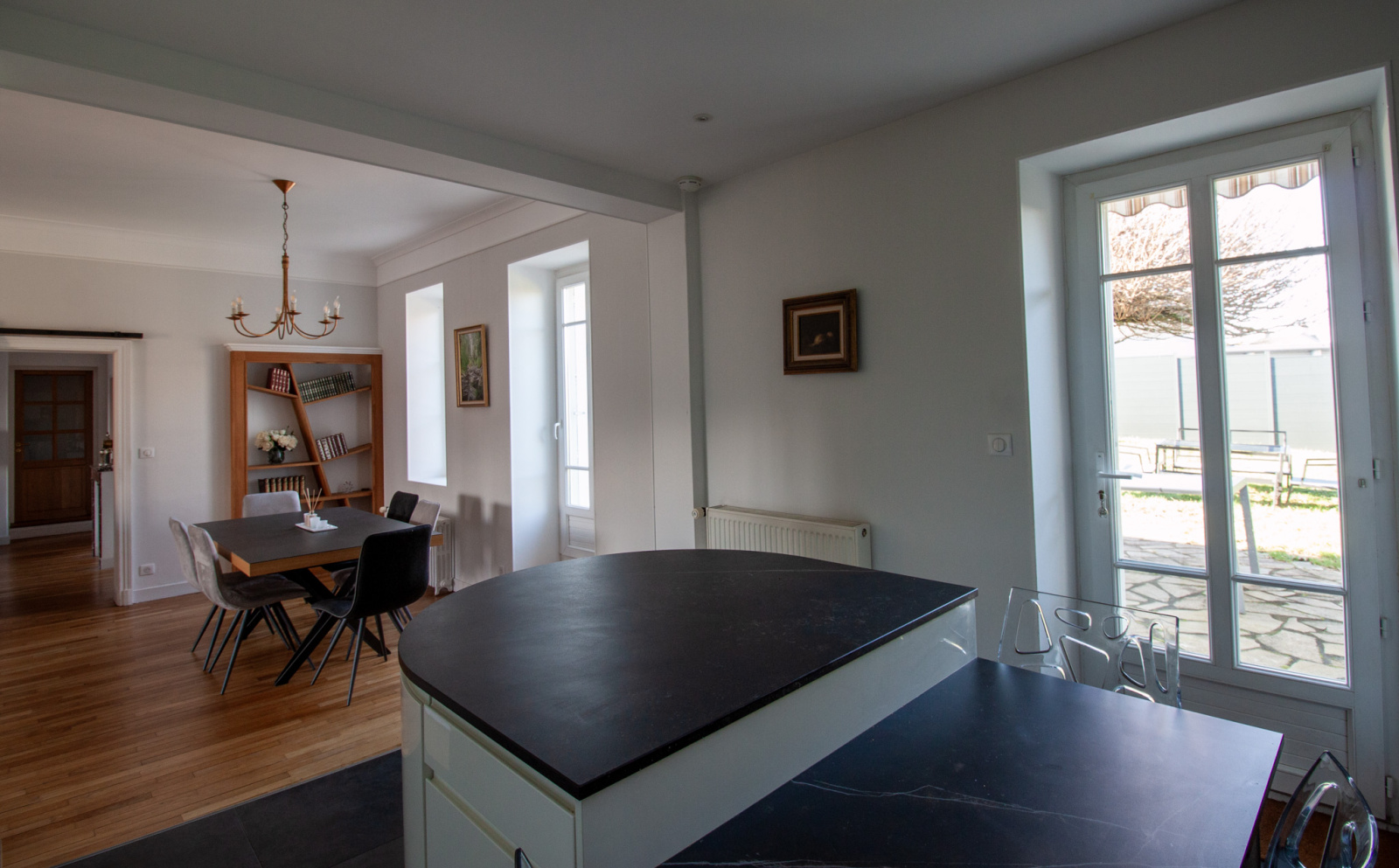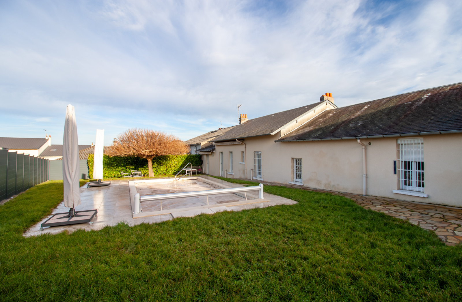 Cet espace de vie donne directement sur un beau jardin agrémenté d’une piscine enterrée, idéale pour profiter des beaux jours.