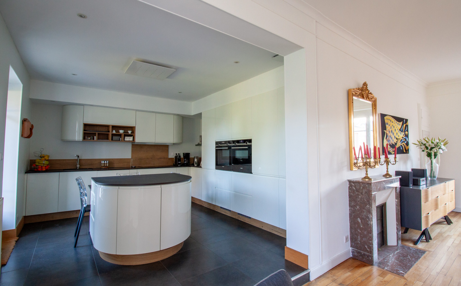 L’appartement se compose d’une grande pièce de vie lumineuse ouvrant sur une cuisine aménagée et équipée de qualité.