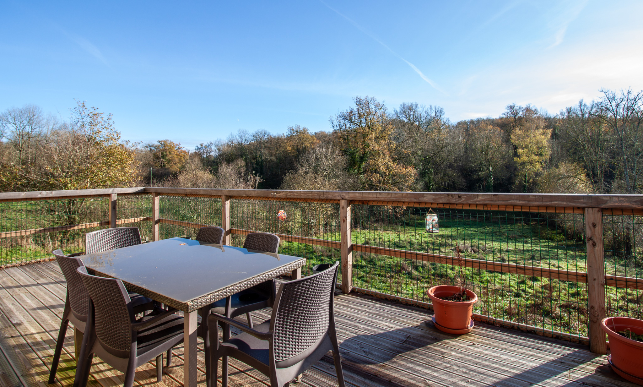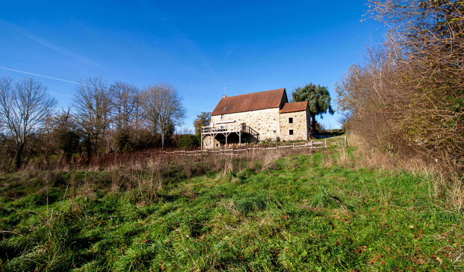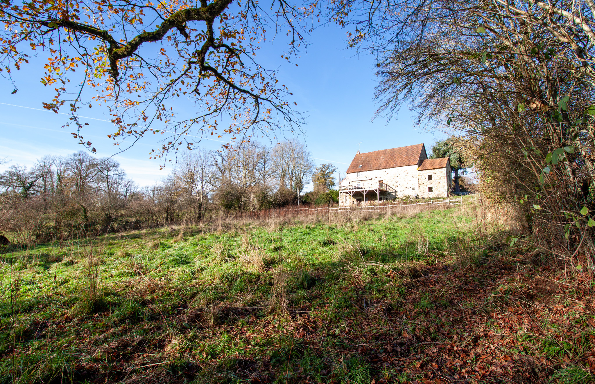 Elle dispose d’une grande terrasse en bois qui surplombe un terrain d’environ trois mille cinq cents mètres carrés. Ce terrain est traversé par une petite rivière qui apporte un charme unique au lieu. L’assainissement est conforme, ce qui constitue un véritable avantage dans ce secteur.