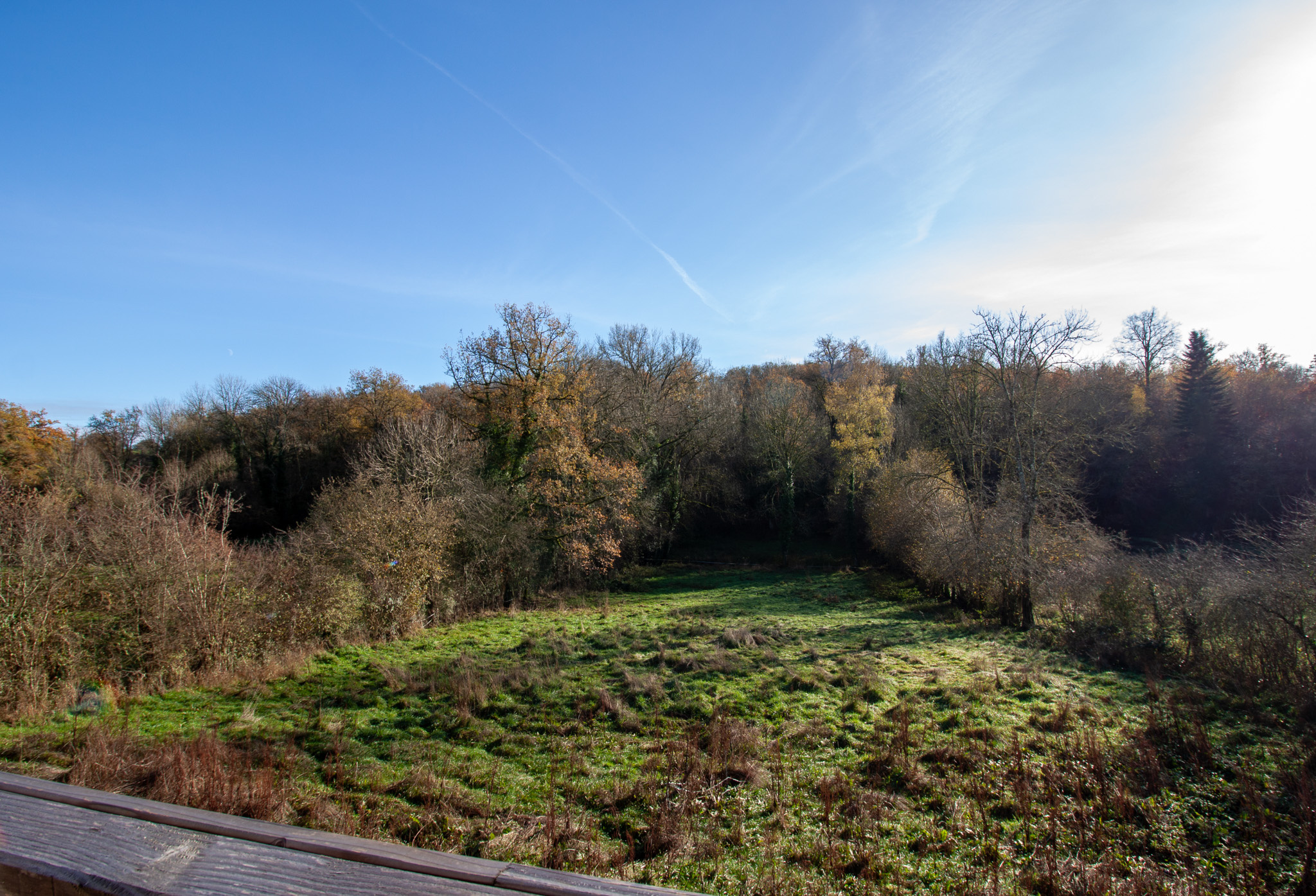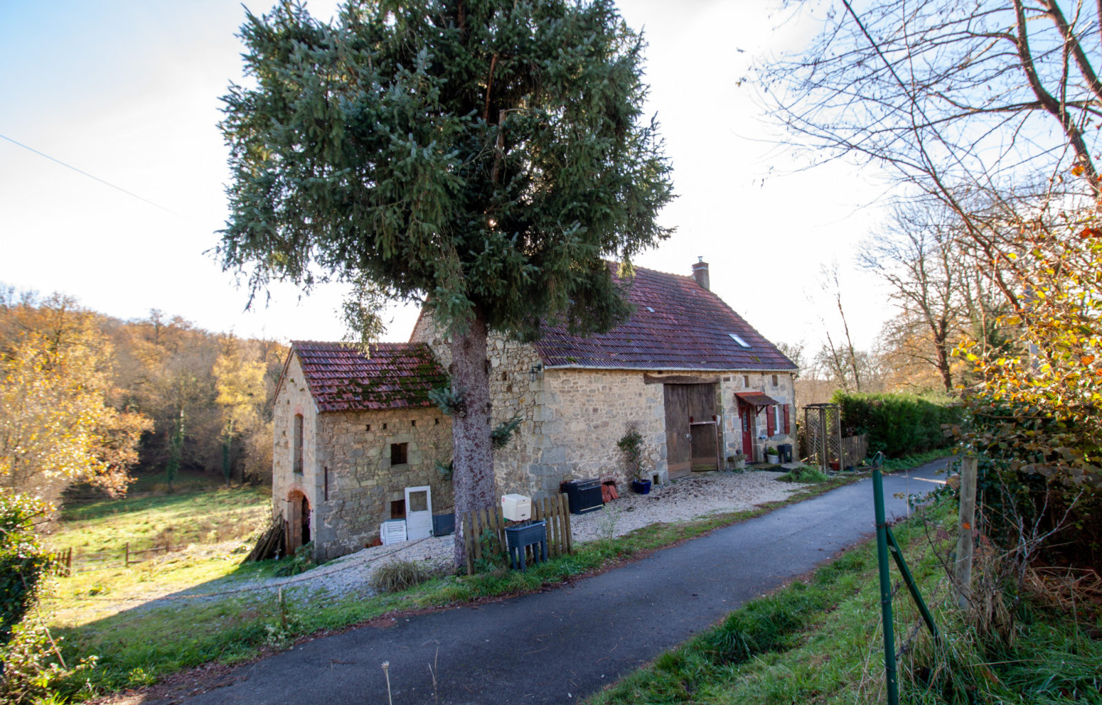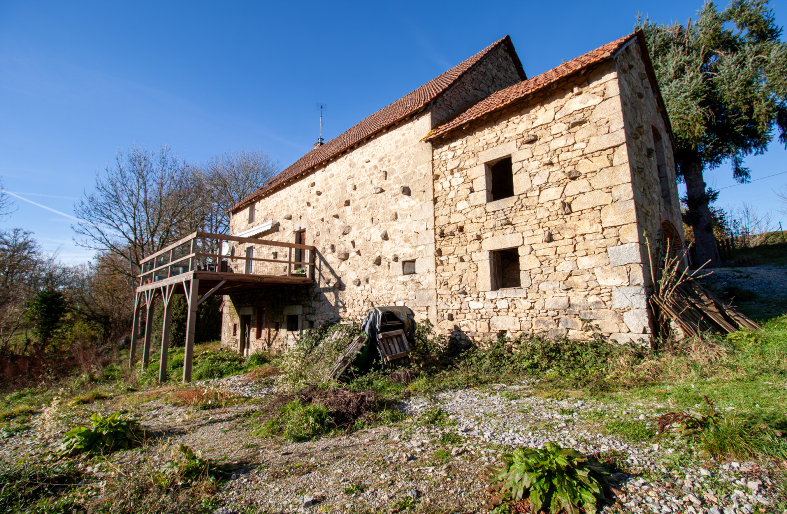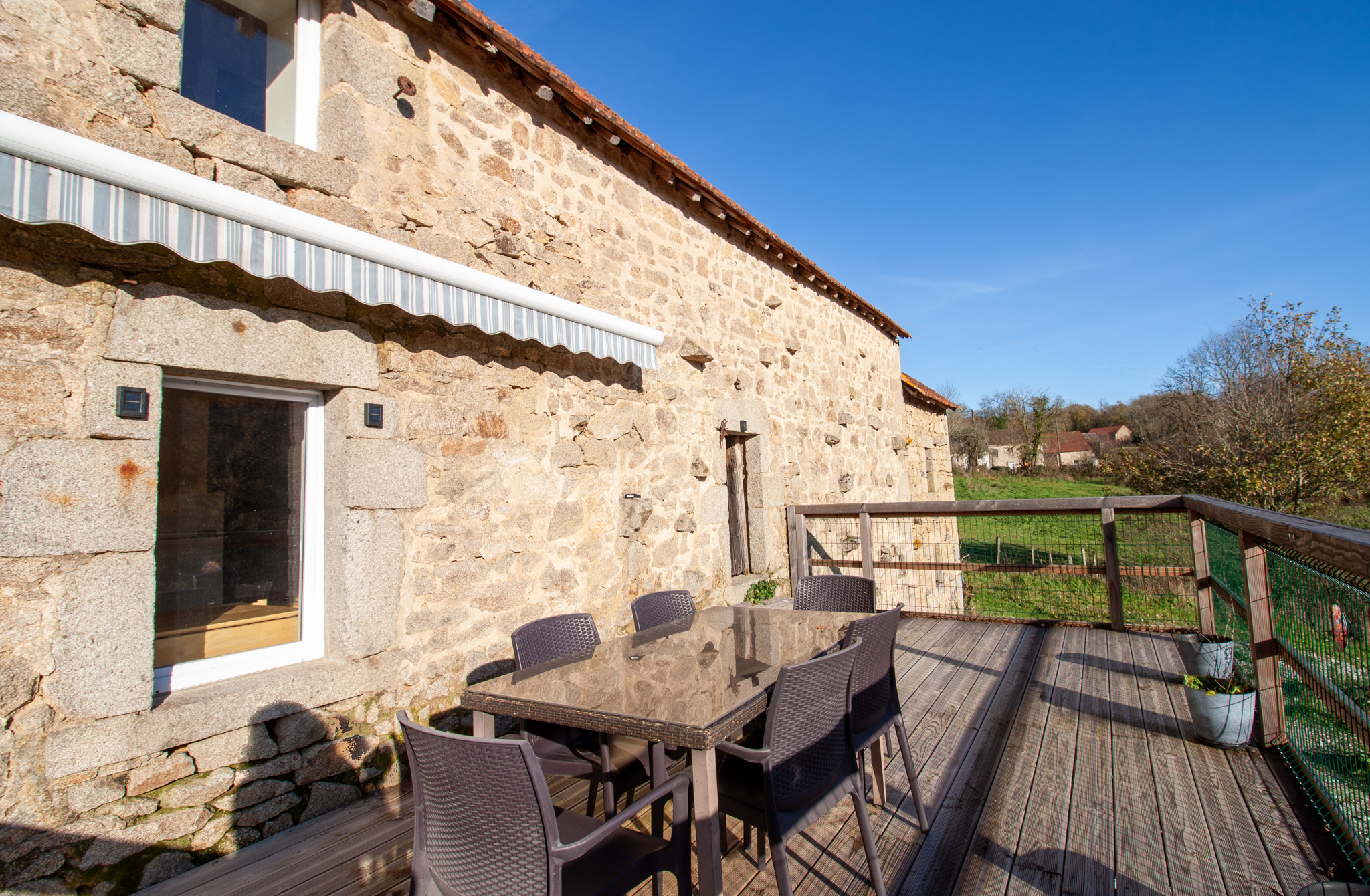 Elle dispose d’une grande terrasse en bois qui surplombe un terrain d’environ trois mille cinq cents mètres carrés. Ce terrain est traversé par une petite rivière qui apporte un charme unique au lieu. L’assainissement est conforme, ce qui constitue un véritable avantage dans ce secteur.