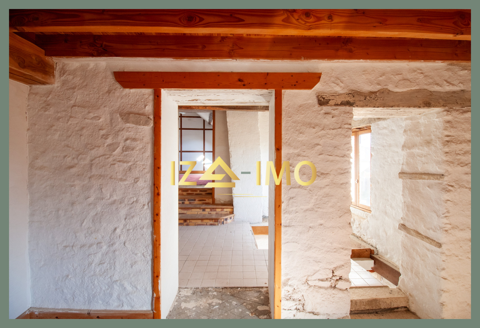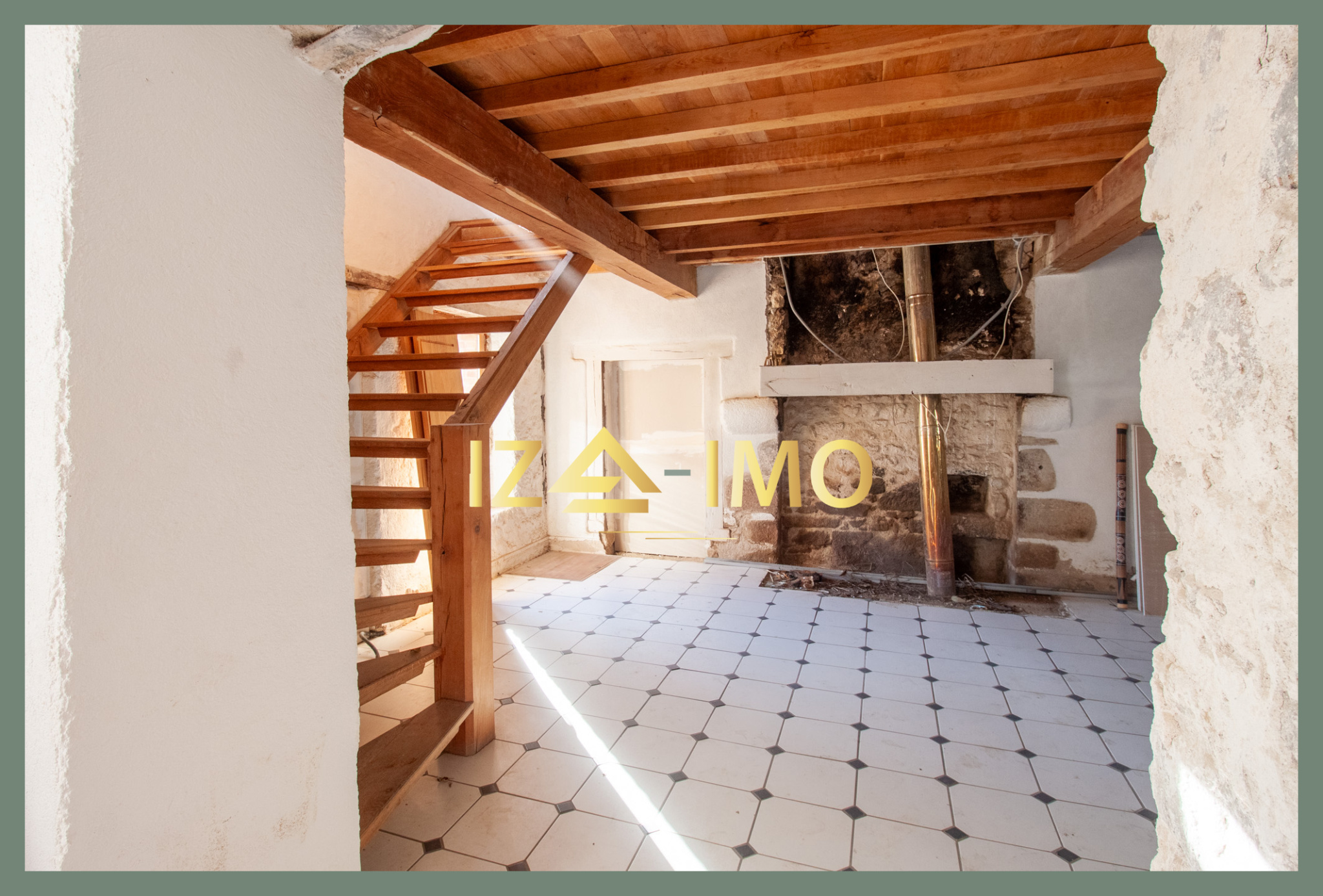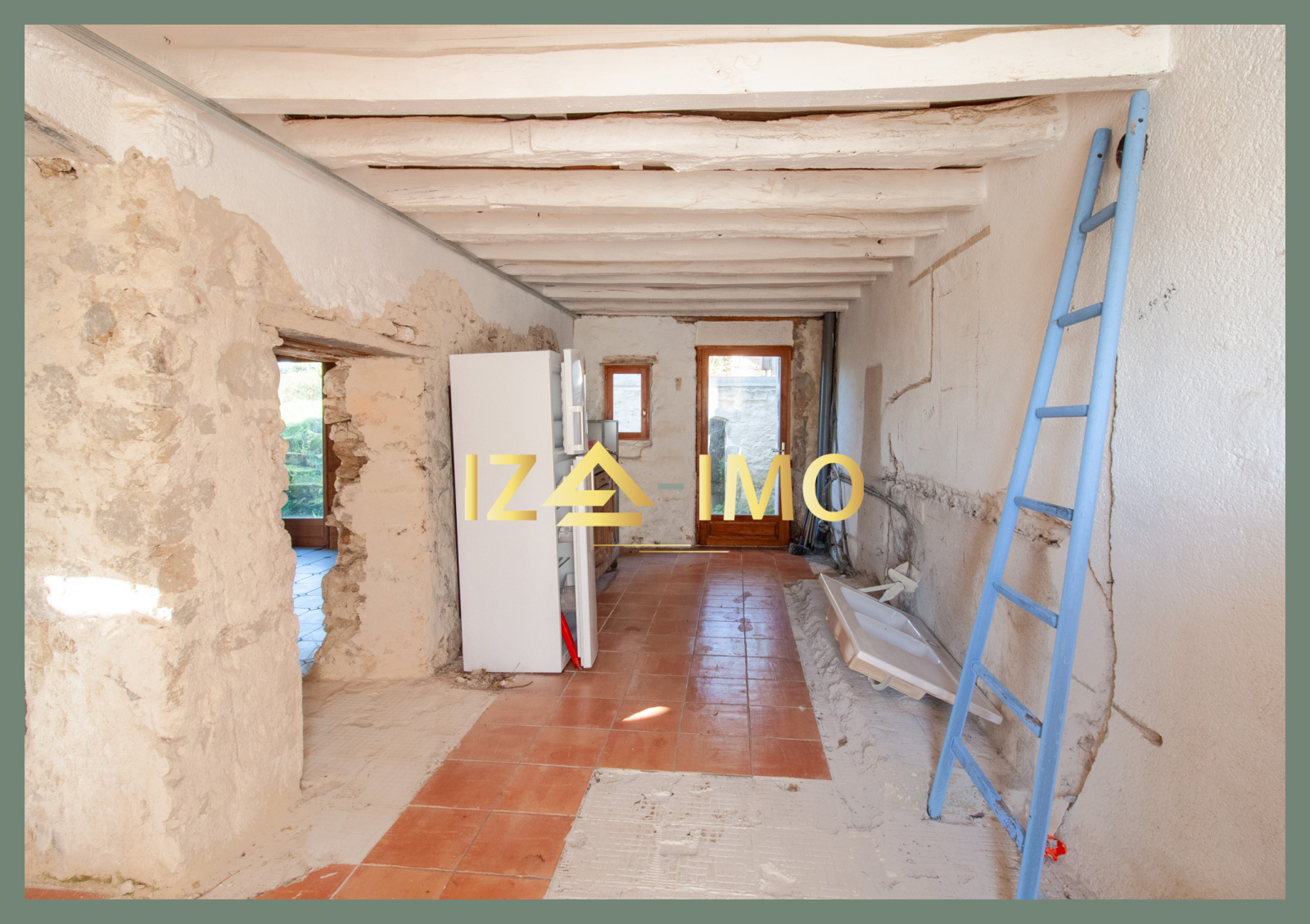 Entrée sur une première pièce avec arrivées et évacuations d’eau en place : un espace pensé pour devenir une future cuisine (installation à prévoir),