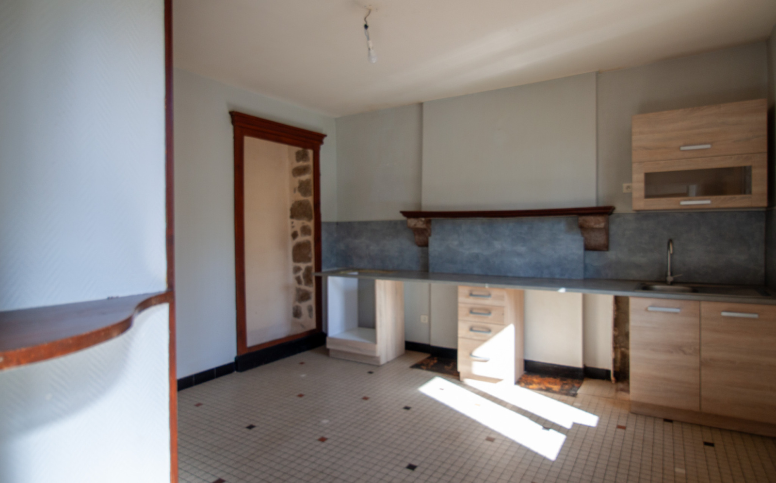 La maison se compose, au rez-de-chaussée, de deux pièces : une spacieuse cuisine et un salon cosy équipé d’un poêle à bois, agrémenté d’un ancien placard en bois qui ajoute au charme de l’ensemble.