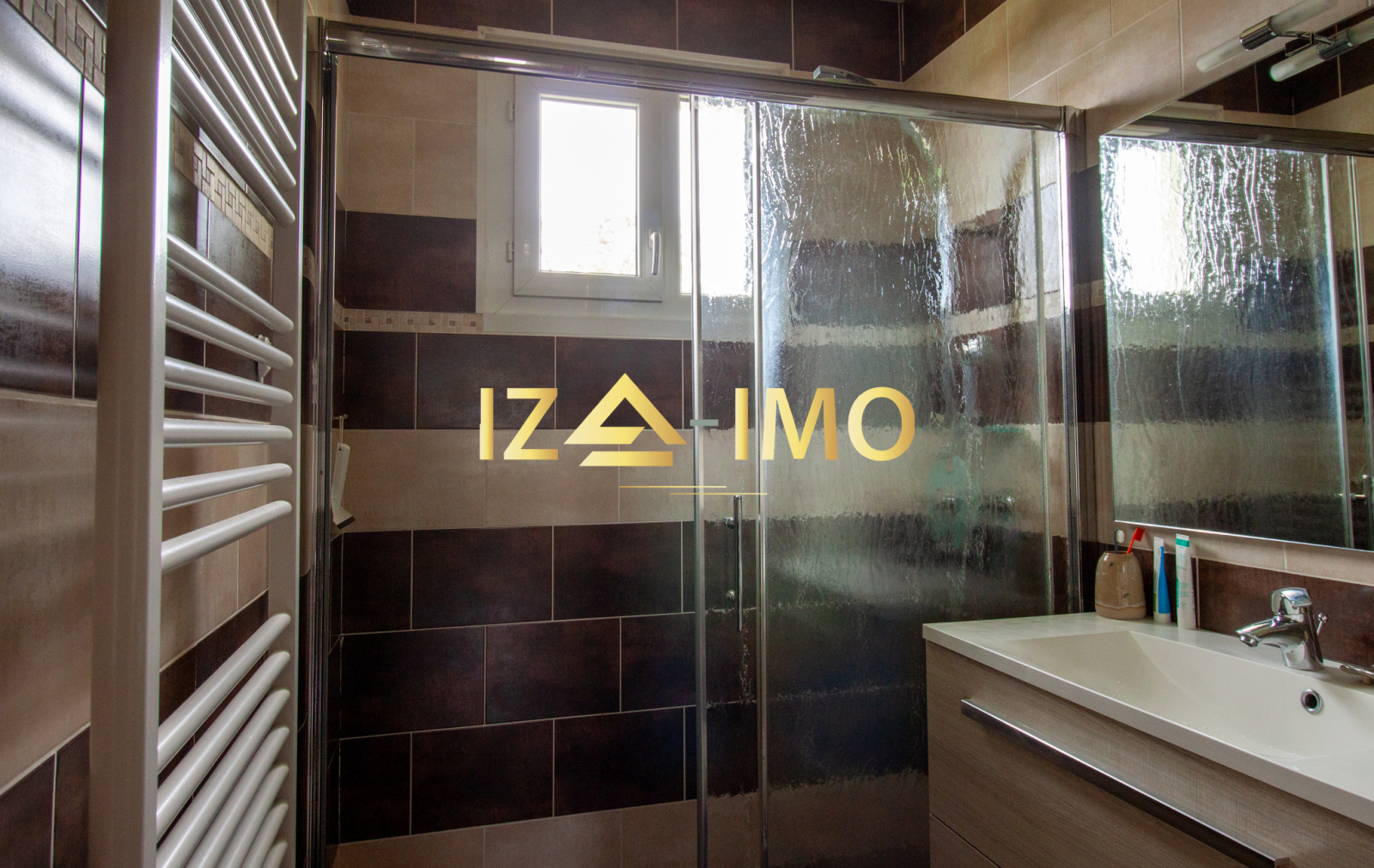 Une salle d’eau rénovée, équipée d’une douche, meuble vasque