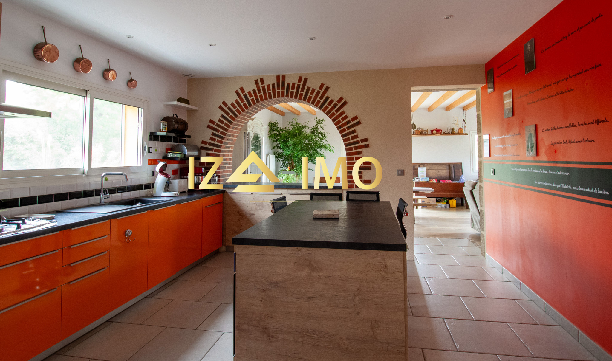 Elle comprend un espace salon-salle à manger convivial avec poêle à bois, ainsi qu’une magnifique cuisine moderne, entièrement aménagée et équipée, avec un îlot central et de nombreux rangements intégrés.