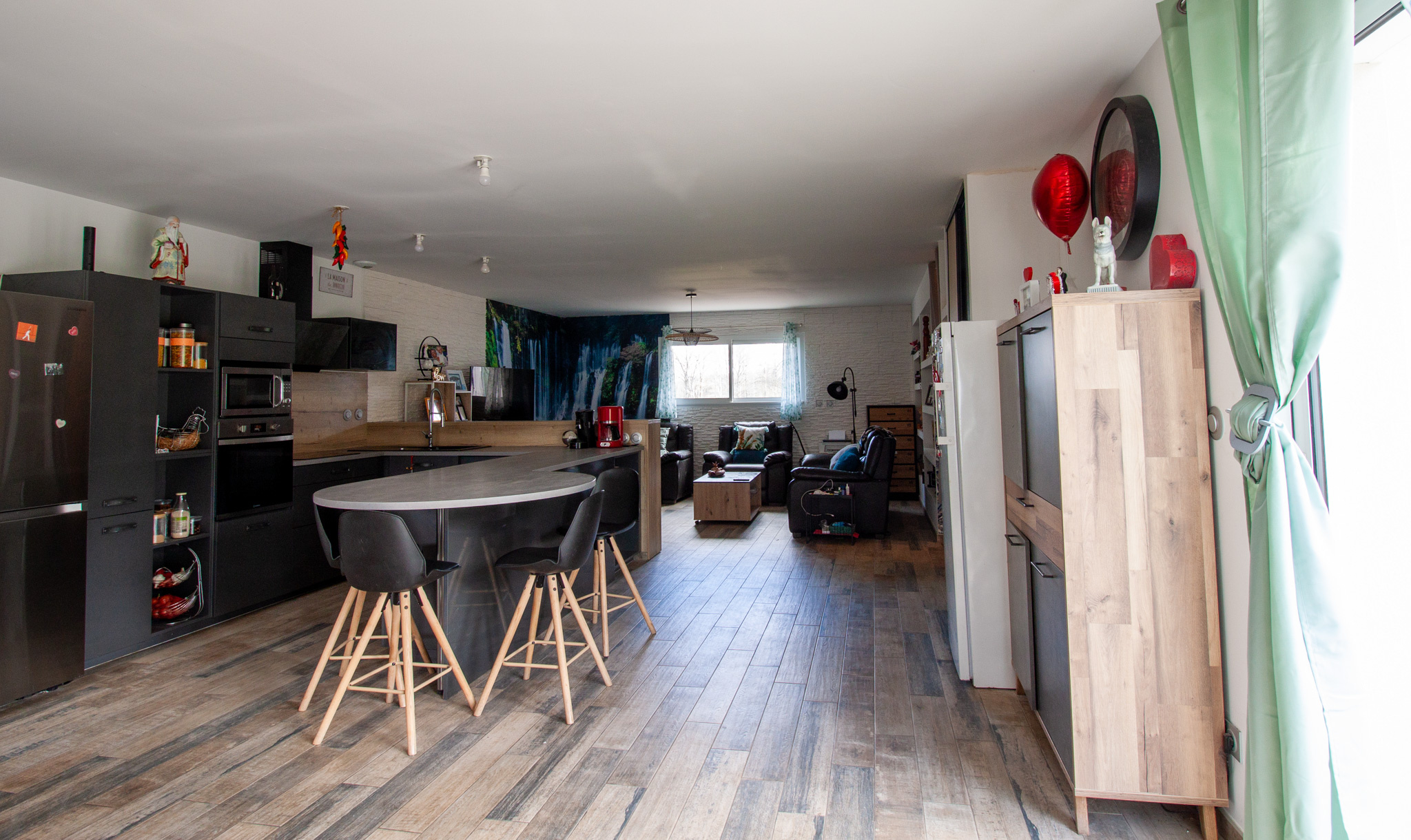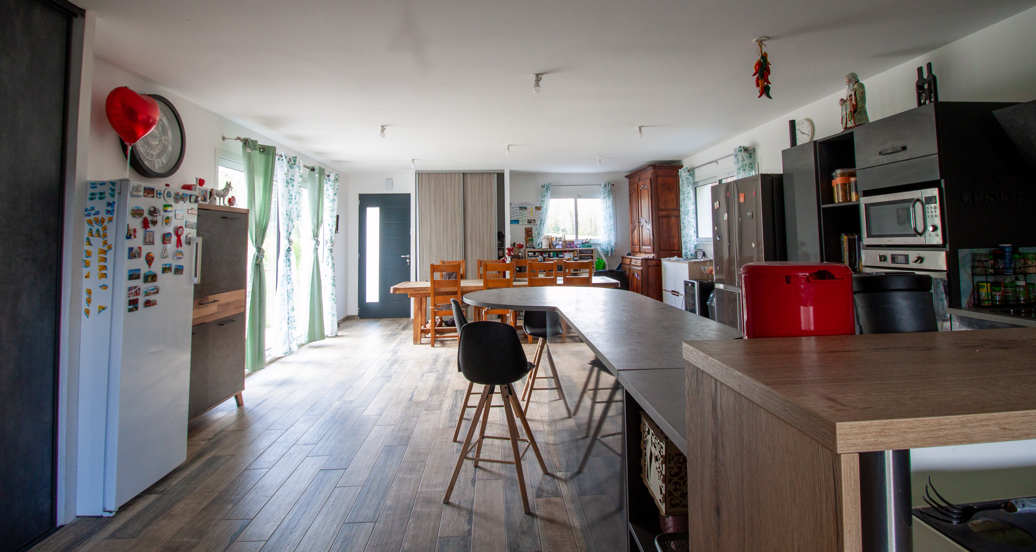 Cette maison se compose d’une superbe pièce de vie très lumineuse avec cuisine aménagée, ouverte sur une belle terrasse. Chaque espace — salon, salle à manger et cuisine — est harmonieusement délimité, offrant un cadre de vie à la fois convivial et fonctionnel.